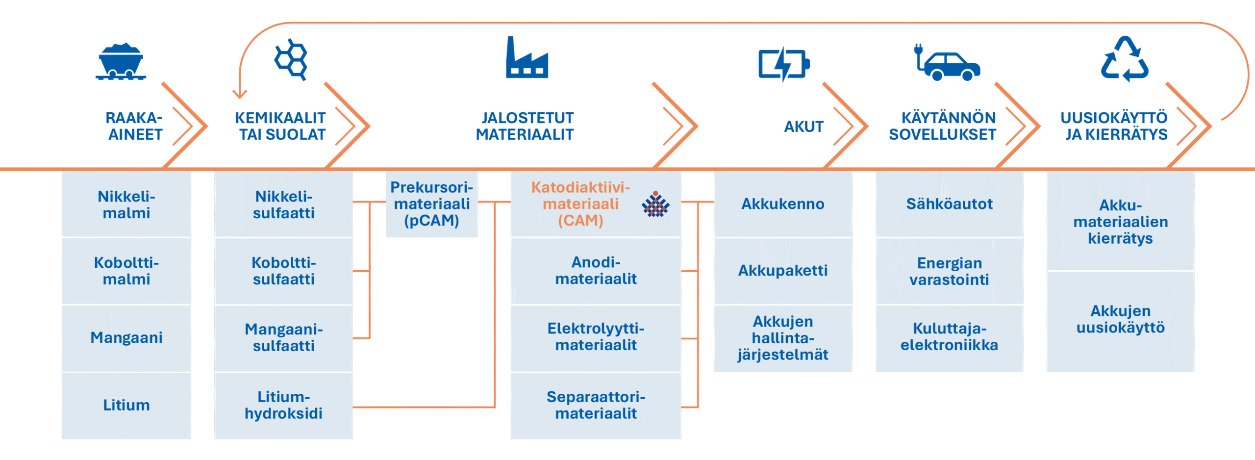 Katodiaktiivimateriaali (CAM) valmistetaan eri raaka-aineista, kuten prekursorista (pCAM) ja litiumhydroksidista. Kun CAM on tuotettu, se kuljetetaan akkutehtaille. Valmiita akkuja käytetään esimerkiksi sähköautoissa, energian varastoinnissa ja kannettavissa laitteissa. Akku kierrätetään, kun sen elinkaari on tullut päätökseen.