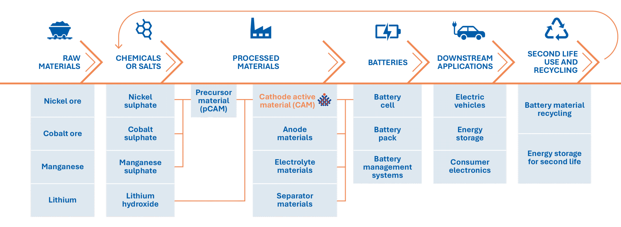 Cathode active material (CAM) is made of different ingredients, such as precursor (pCAM) and lithium hydroxide. Once CAM is produced, it will be transported to battery factories. Finally, the ready batteries will be used in, for example, electric vehicles, energy storage or portable equipment. Once the battery has reached the end of its life cycle, it will be recycled.